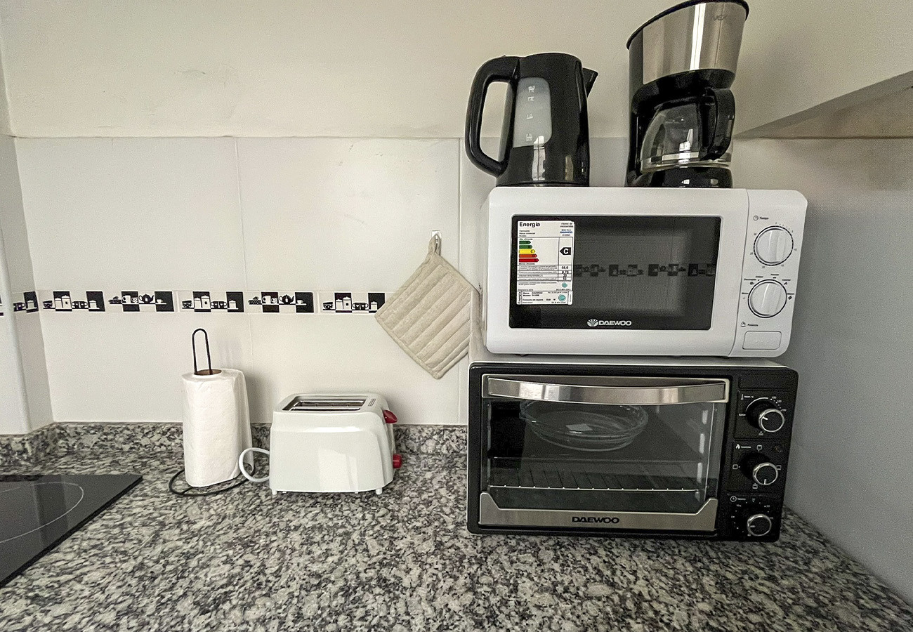 In the electric open plan kitchen, refrigerator, microwave, oven, freezer, dishes/cutlery, kitchen utensils, coffee machine, toaster and kettle are provided.